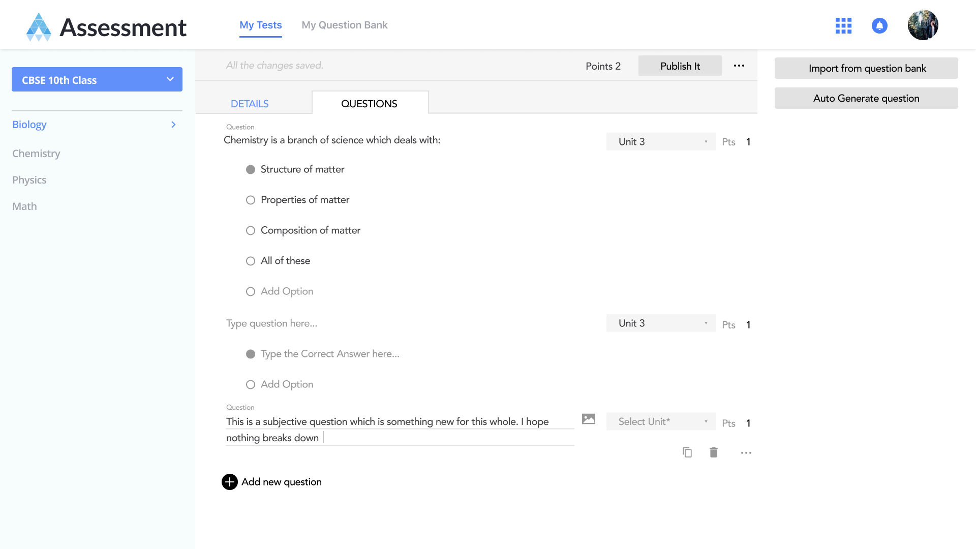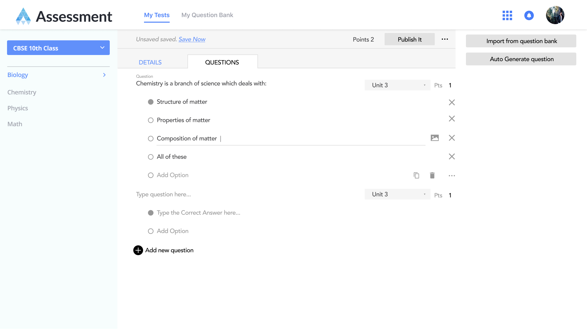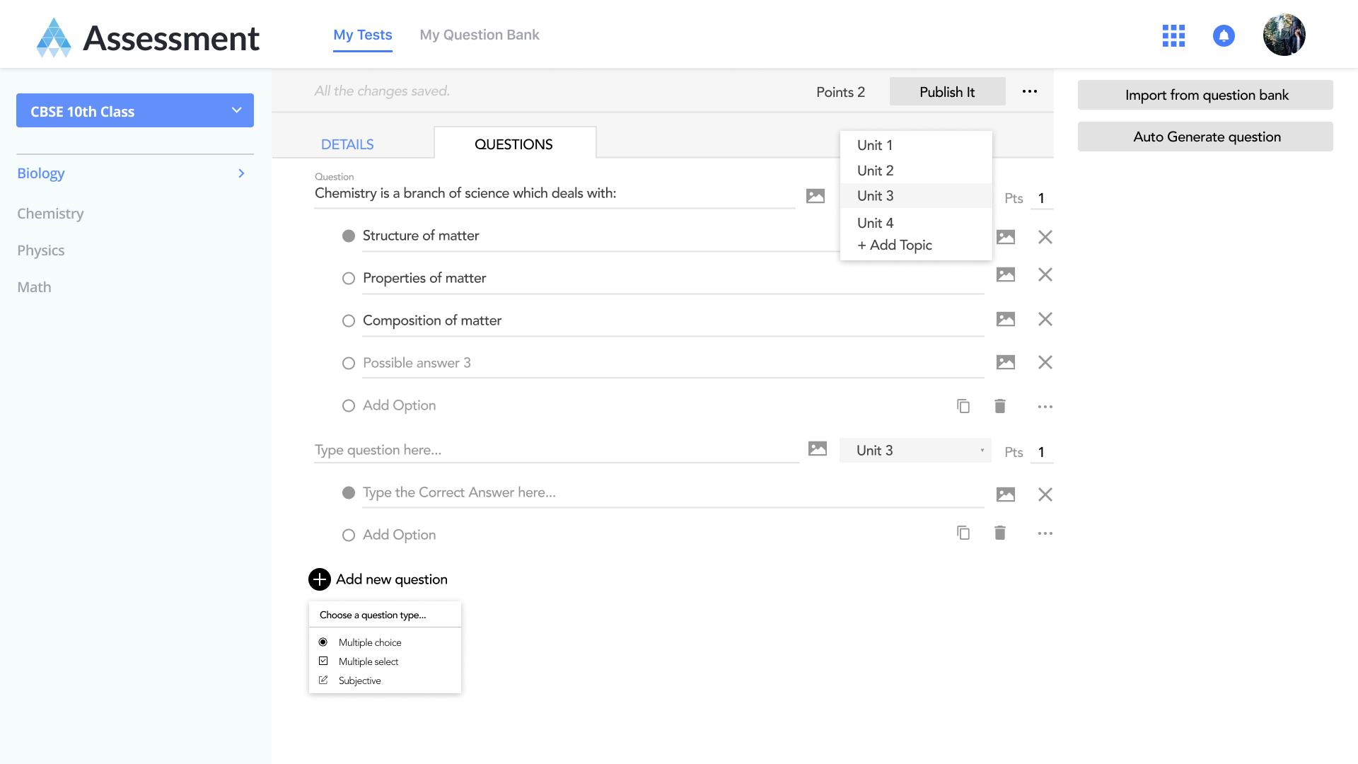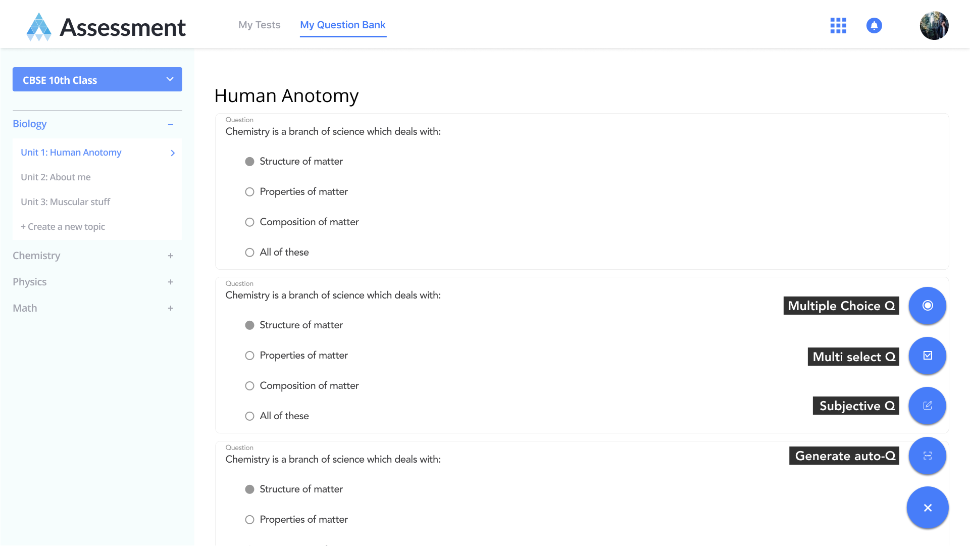 einsAssess, to assist teachers, provides a feature to generate quick questions though some paragraph using ML, and also provides a question bank where you can store questions for future uses.
