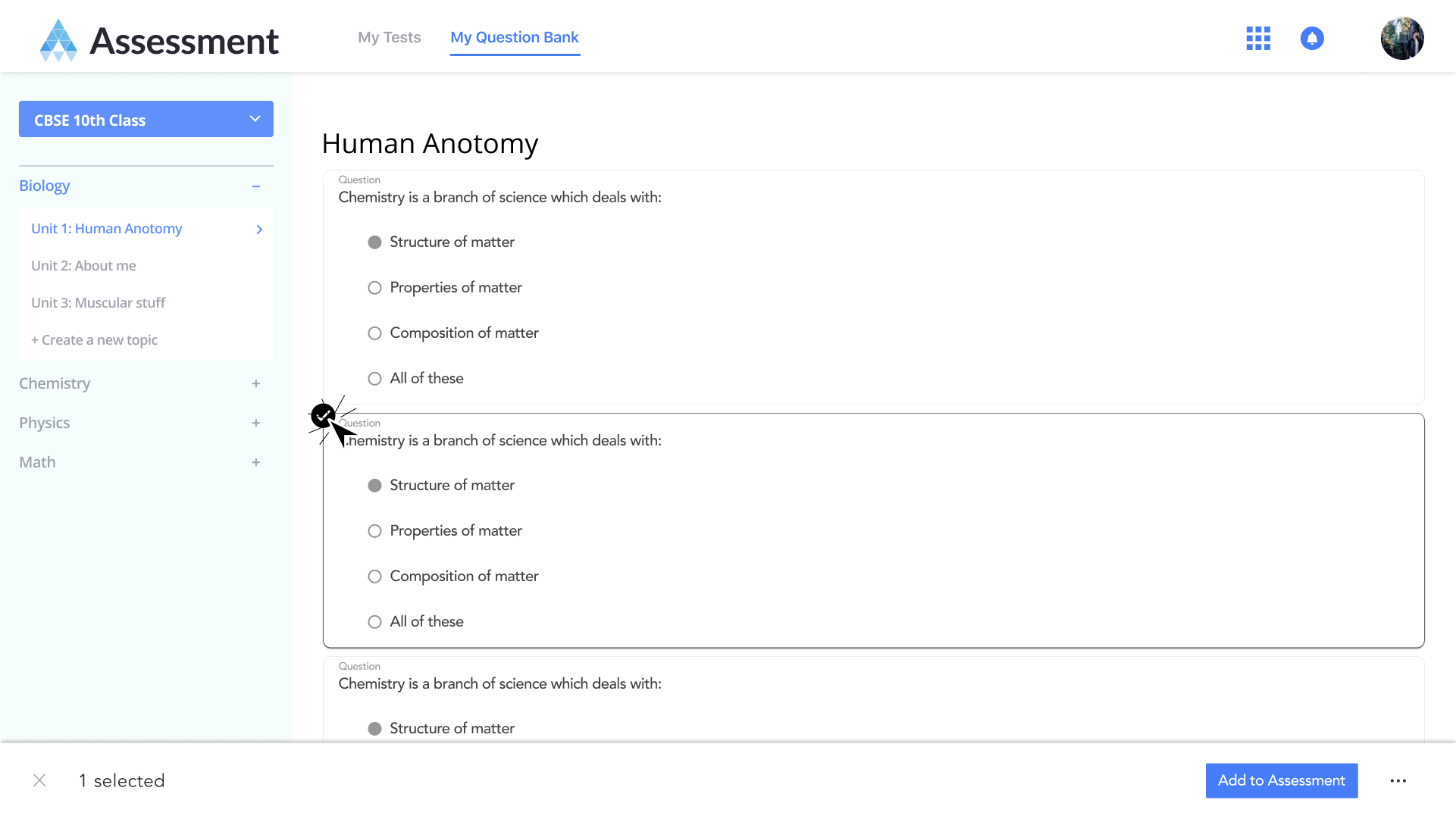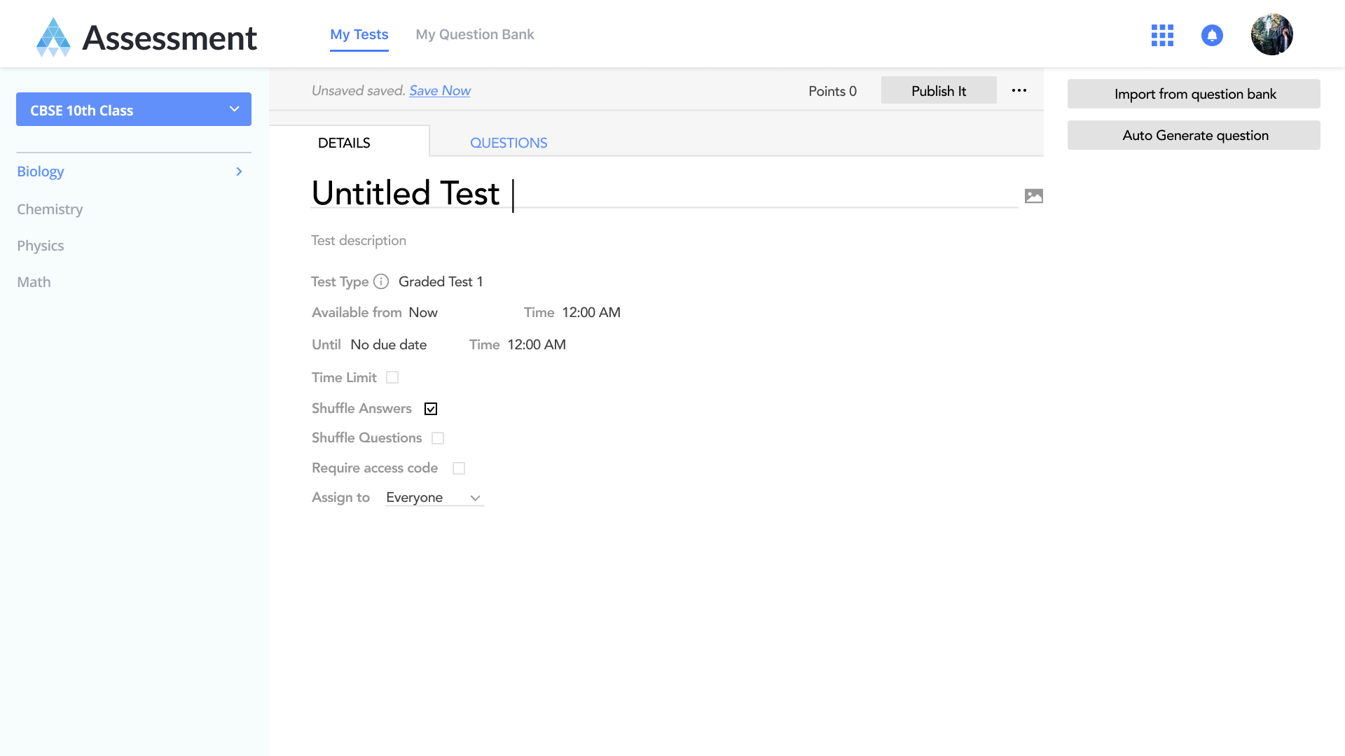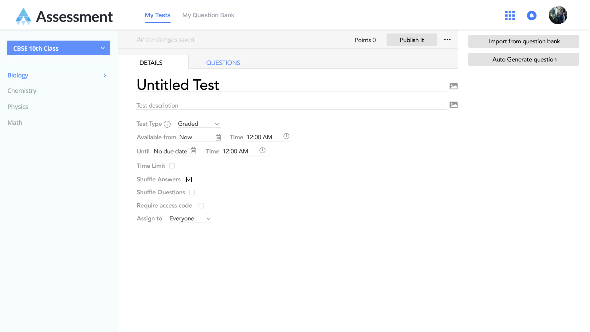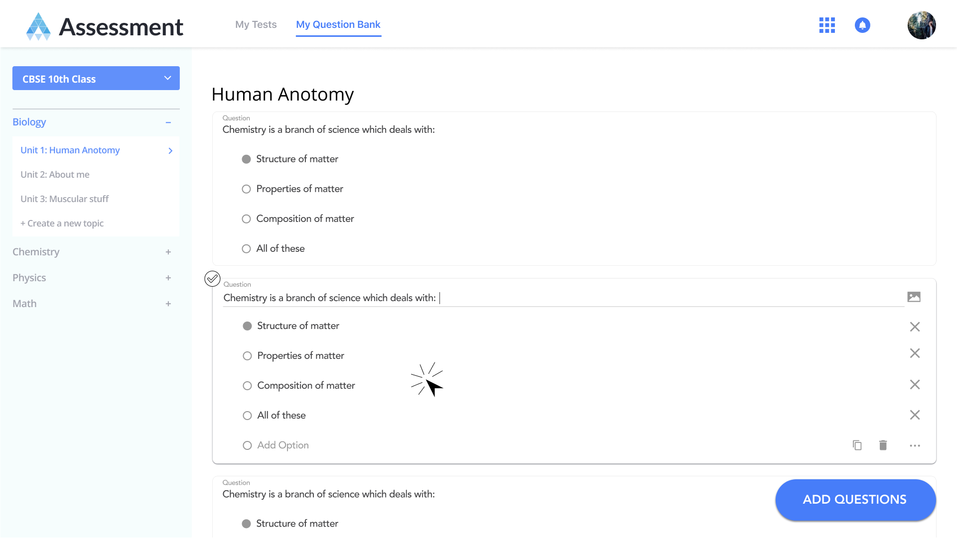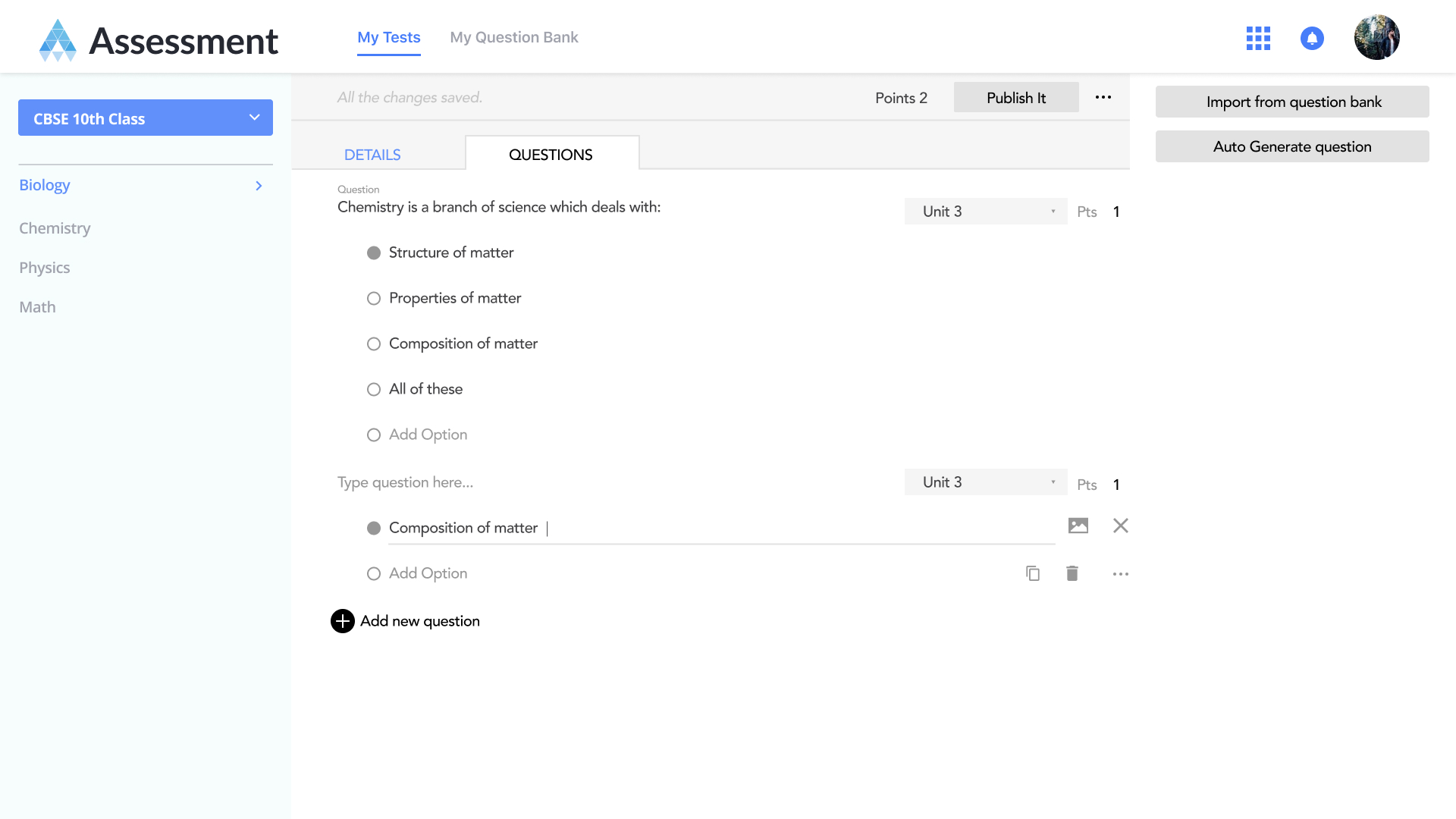einsAssess, to assist teachers, provides a feature to generate quick questions though some paragraph using ML, and also provides a question bank where you can store questions for future uses.