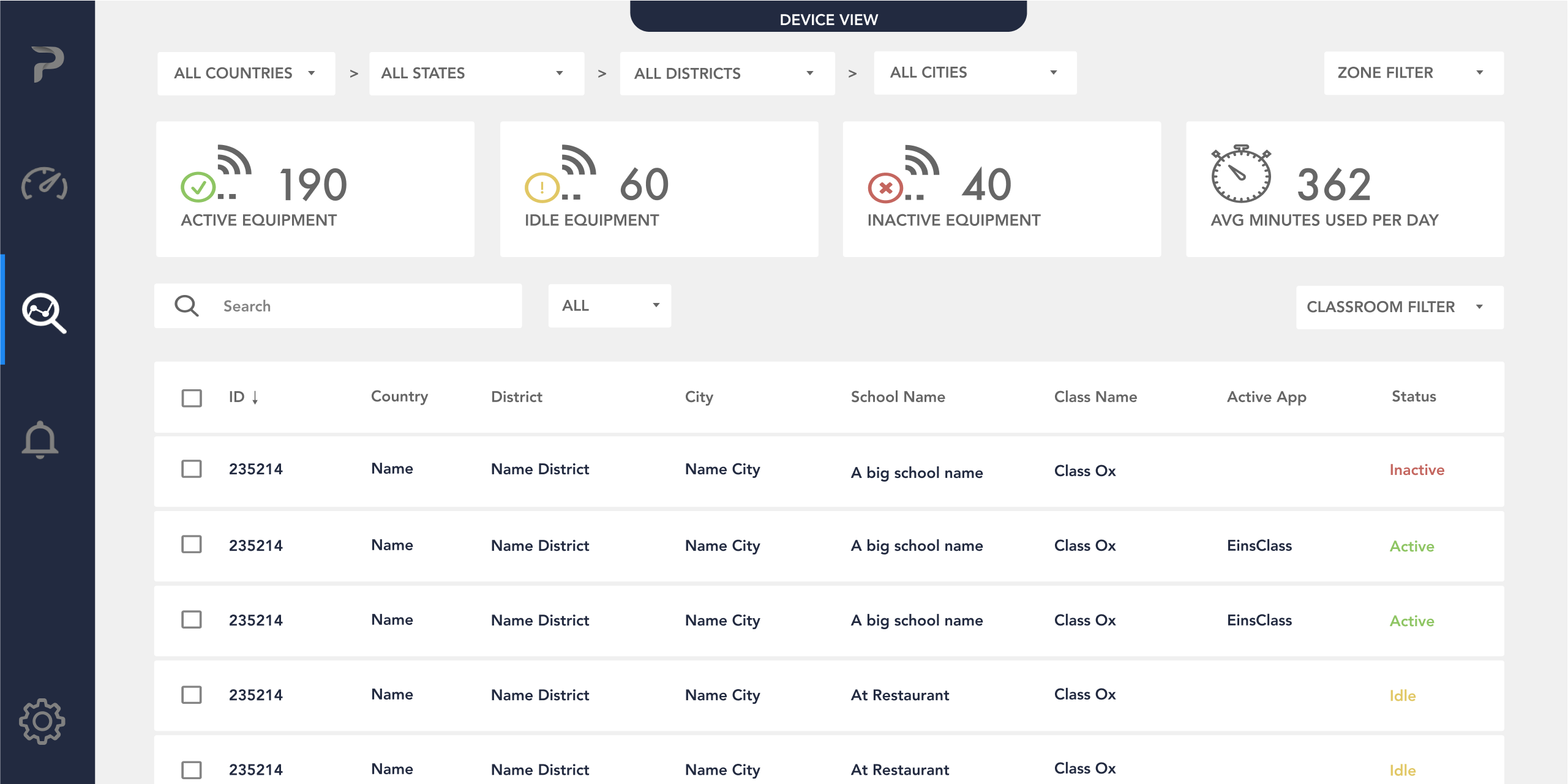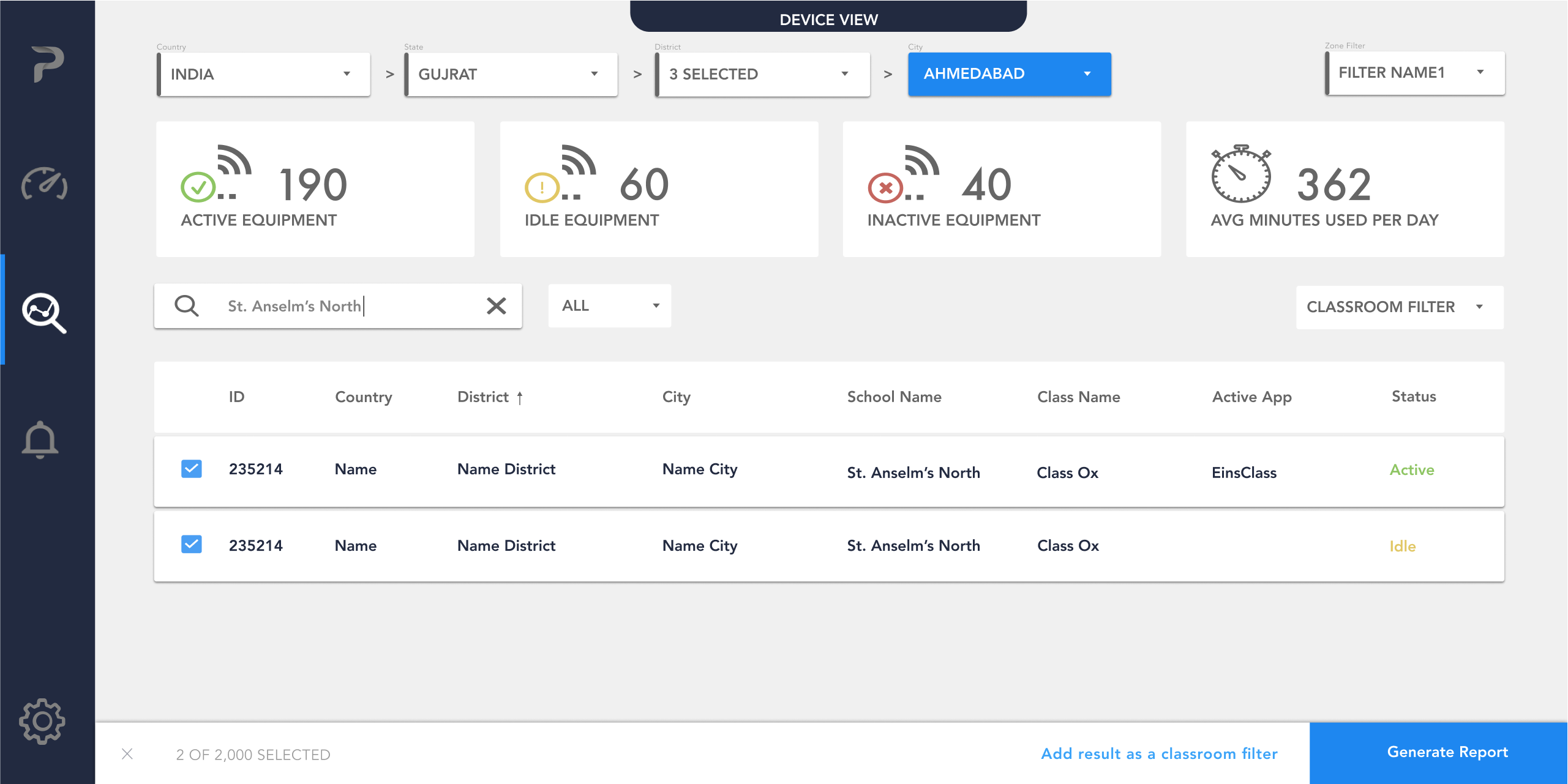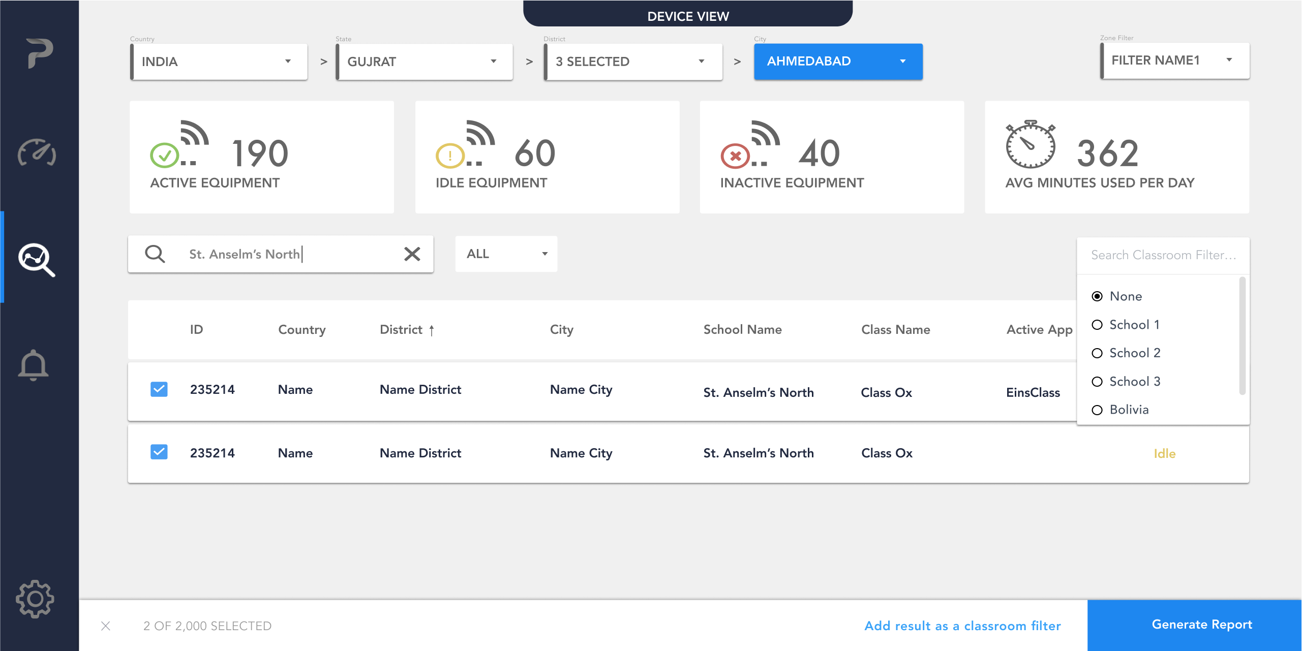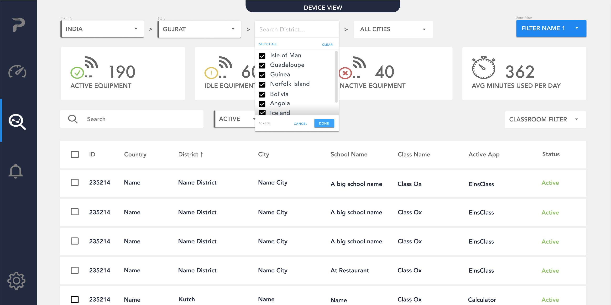 Following is the Admin's Analytics App, it has 2 views, one is Device view that was the original 1st iteration of this app, and the 2nd view is classroom view, that was later added as other einsOS apps came into the picture.