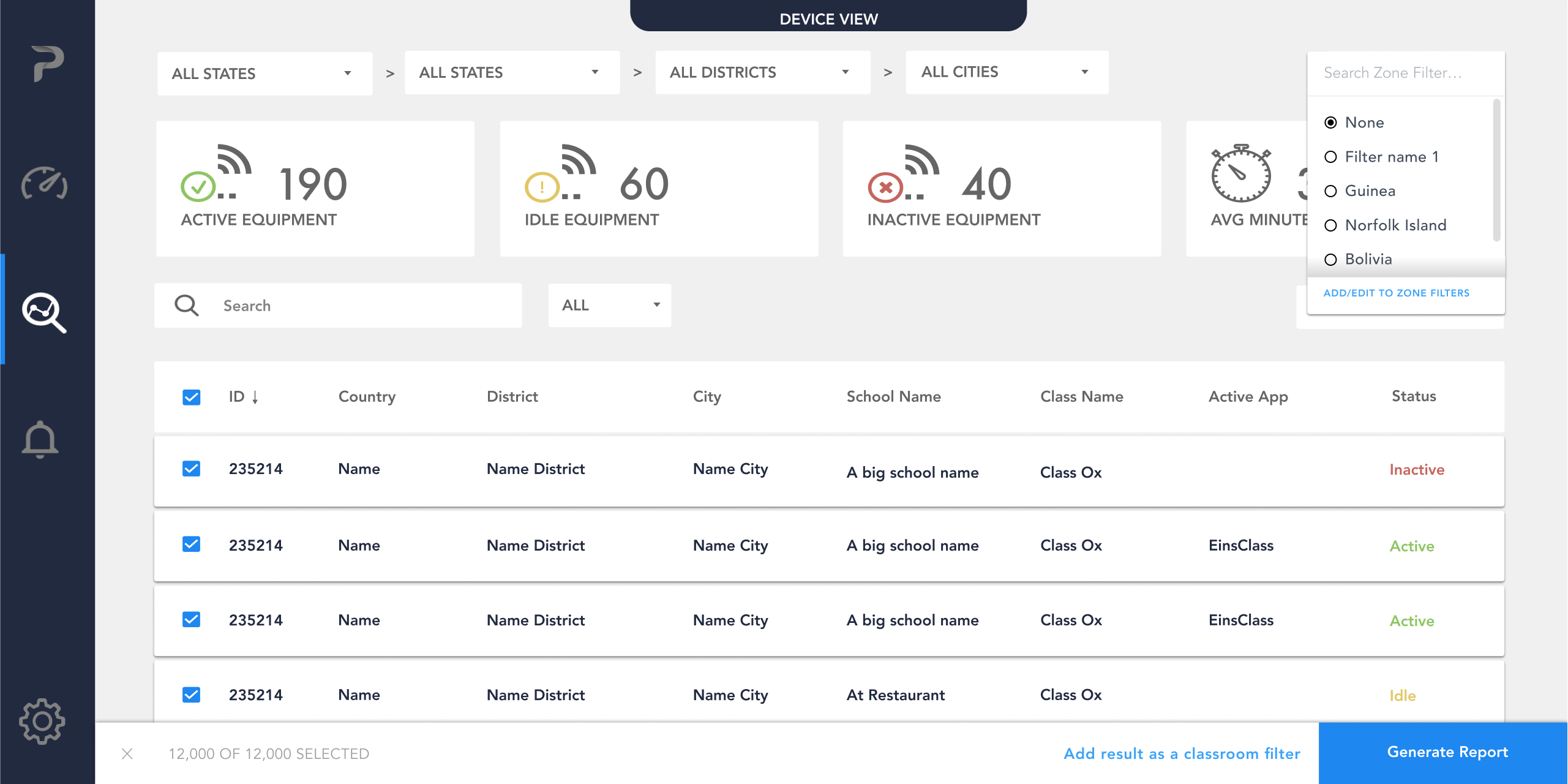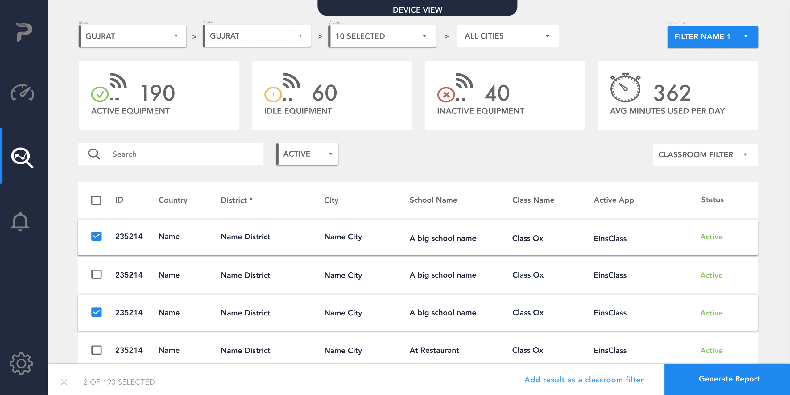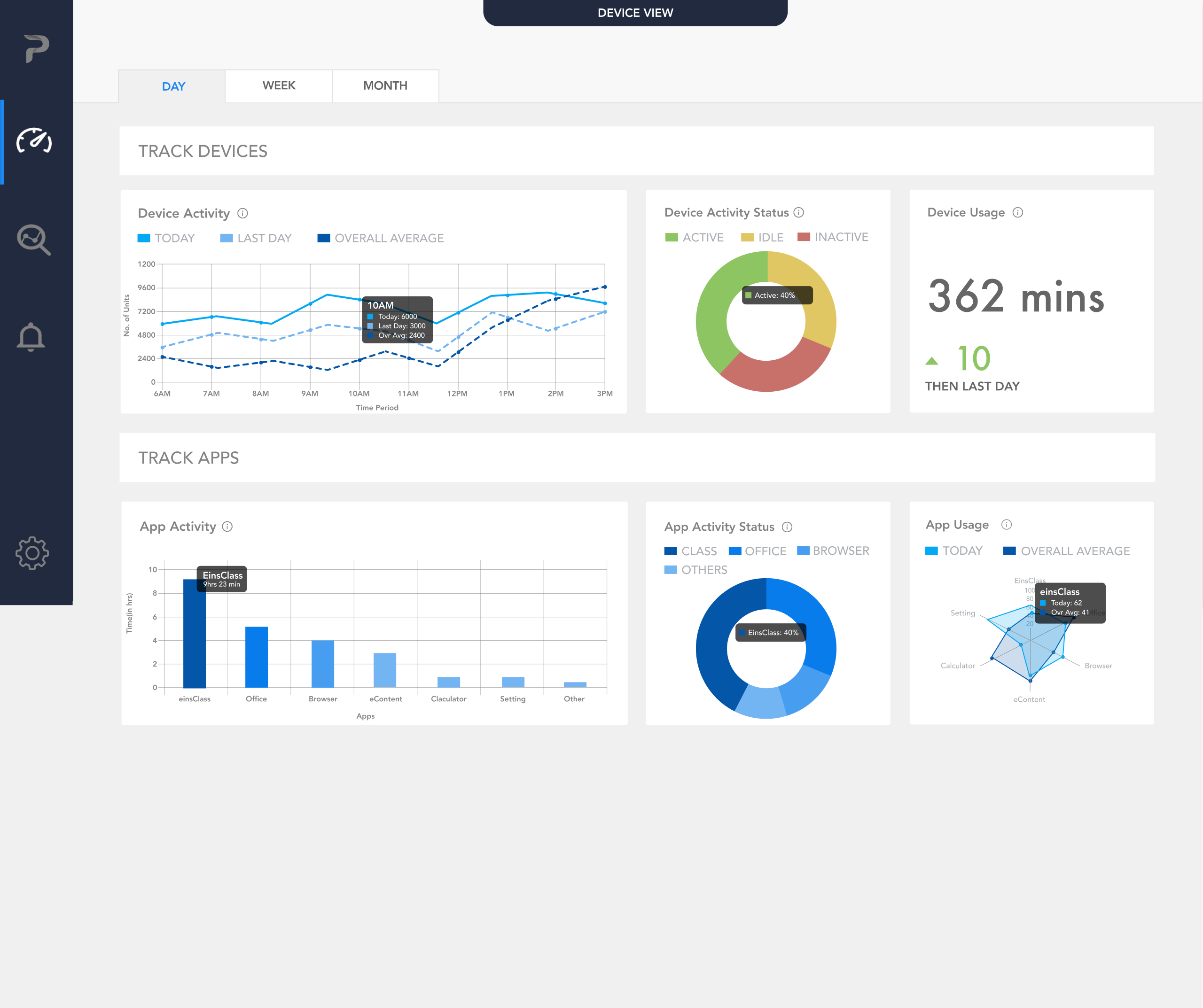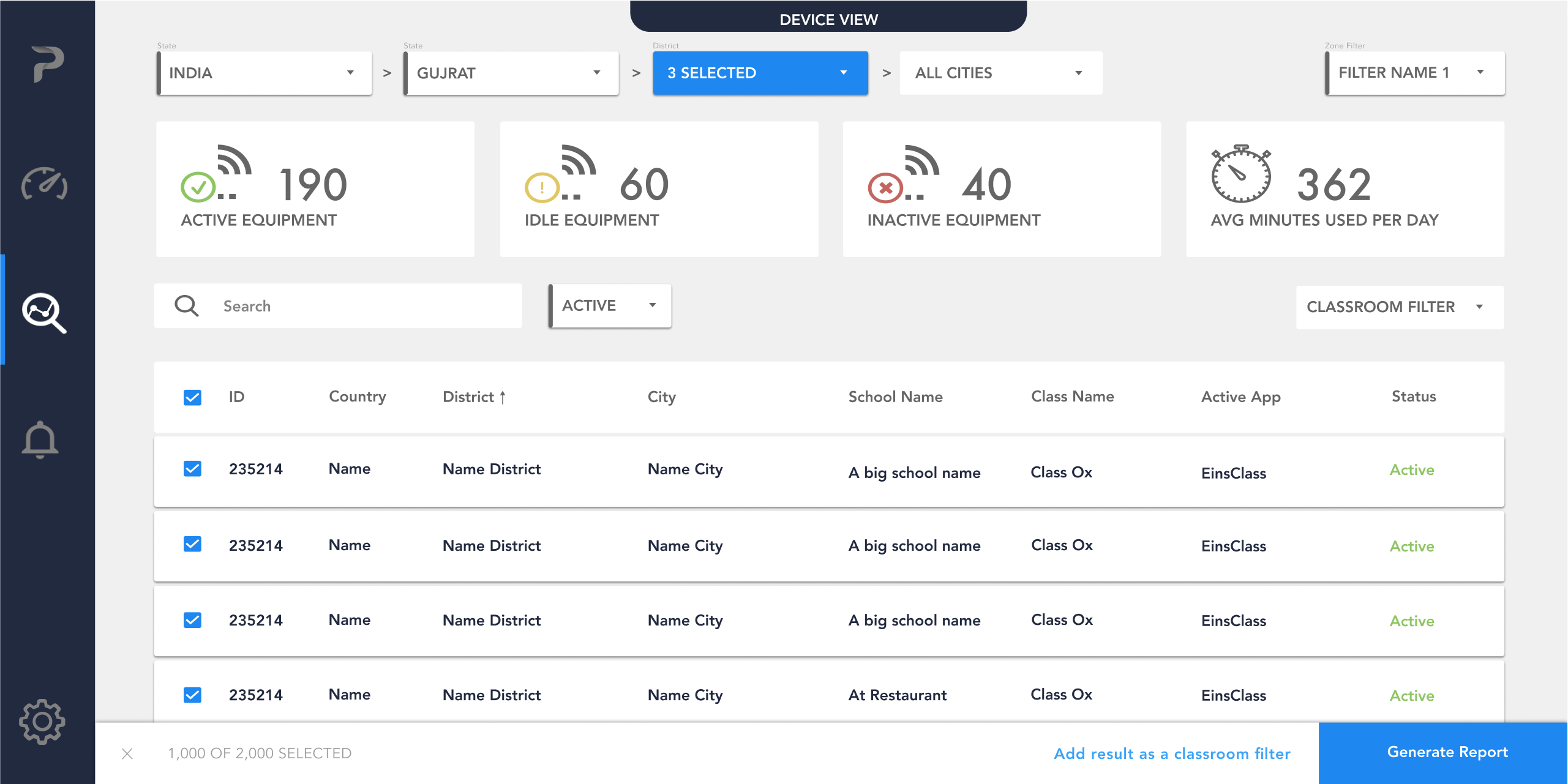 Following is the Admin's Analytics App, it has 2 views, one is Device view that was the original 1st iteration of this app, and the 2nd view is classroom view, that was later added as other einsOS apps came into the picture.