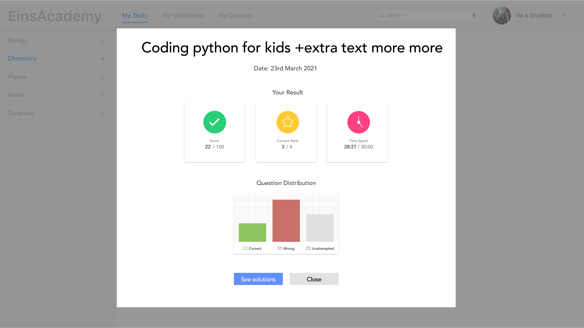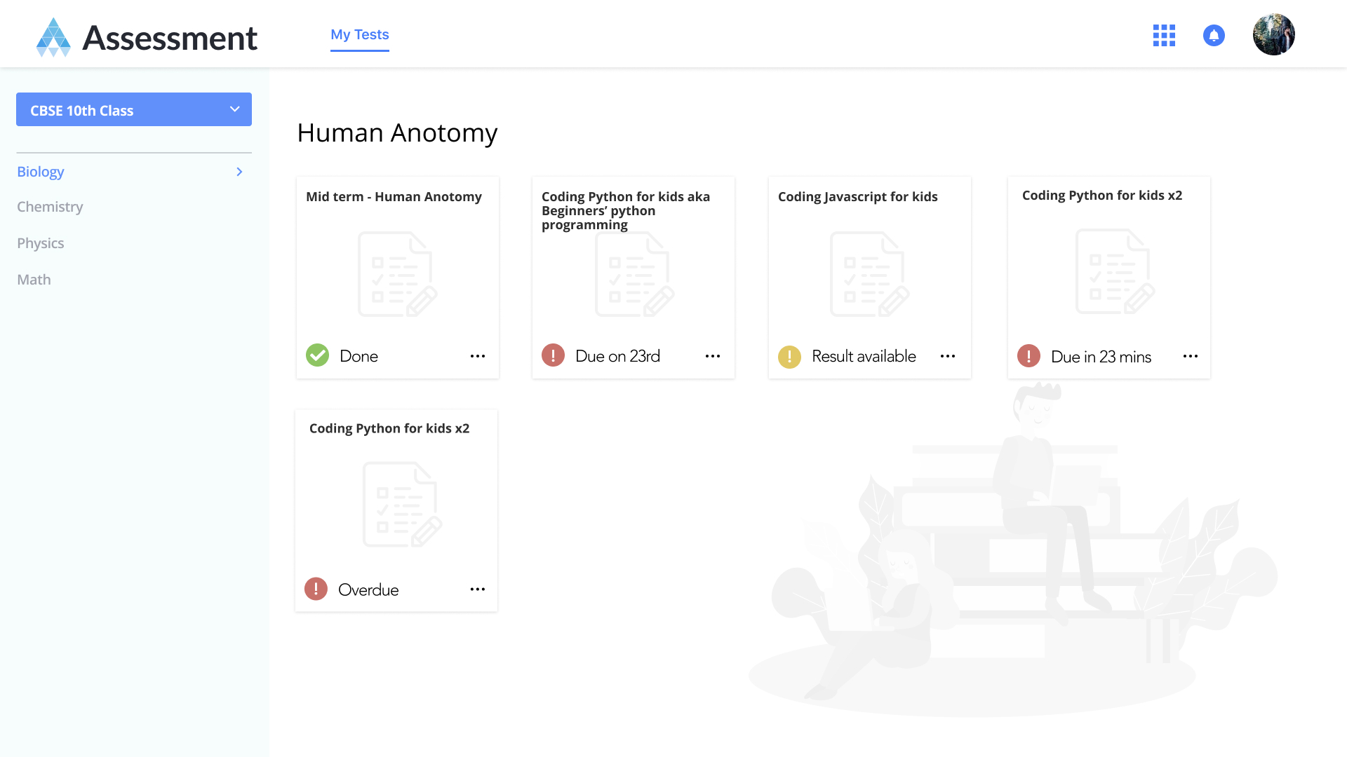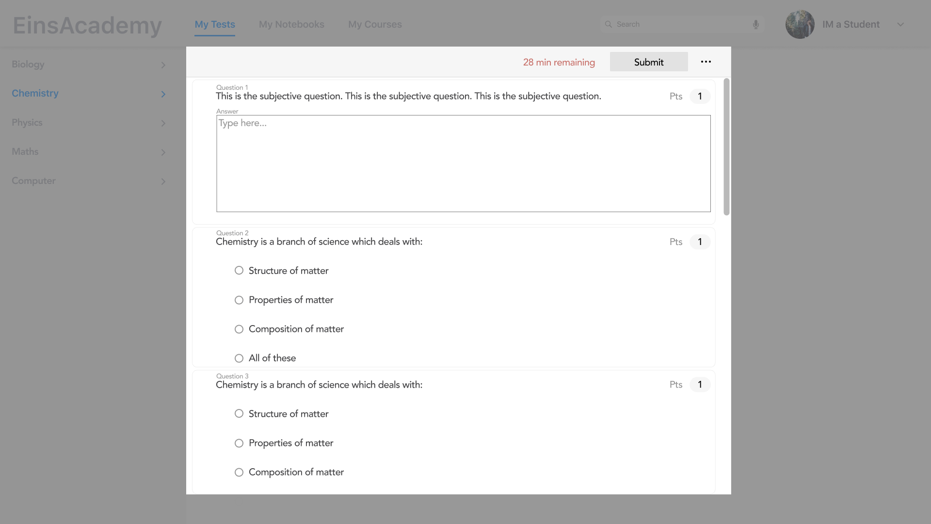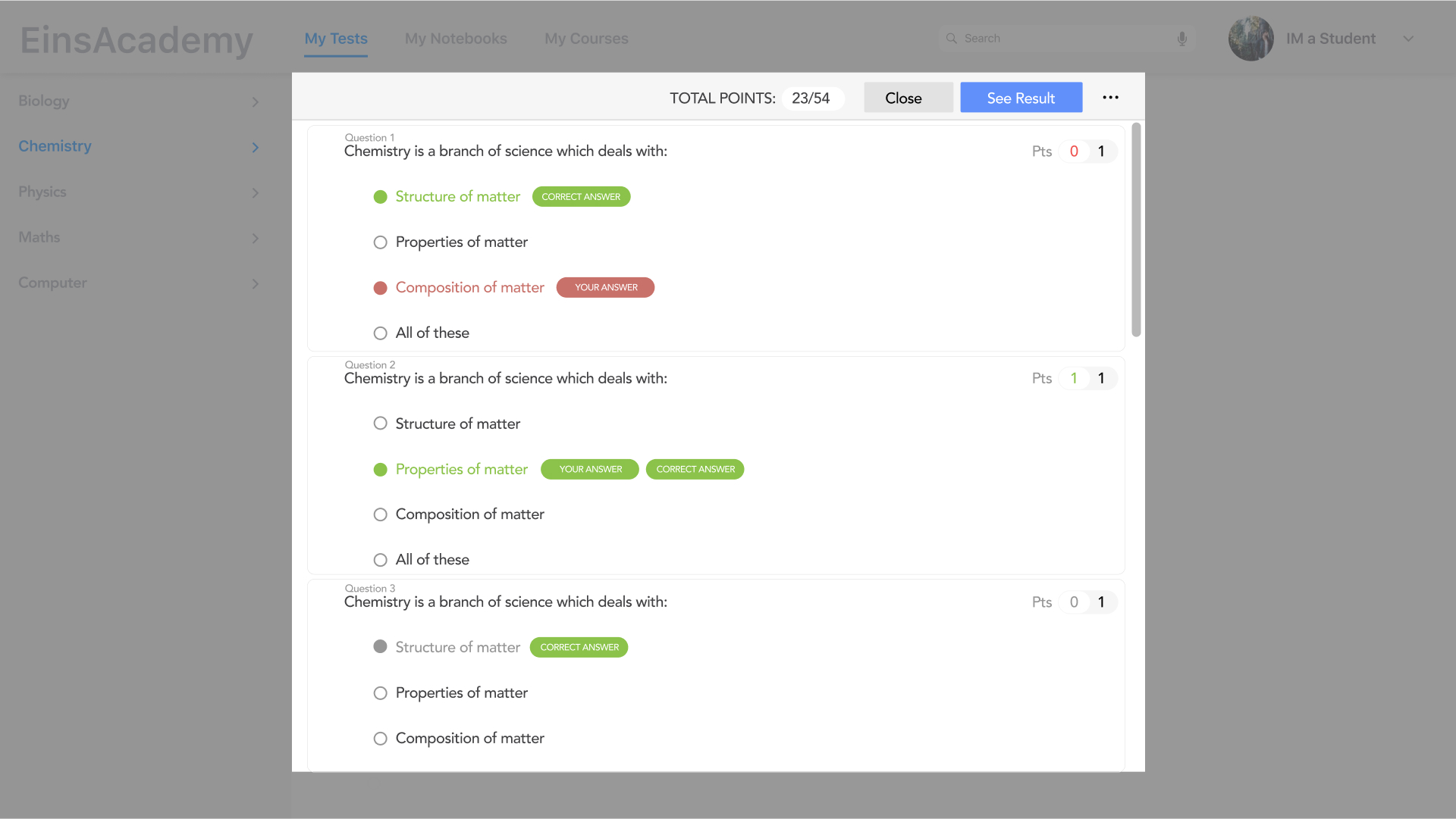 Students see the same einsAssess app in their einsOS dashboard, their einsAssess app shows all the assessments they have received, with their respective statuses. Assessments consisting of all objective questions are automatically marked but assessments with subjective questions are sent to teachers for marking, only after that the results are available for the students.
