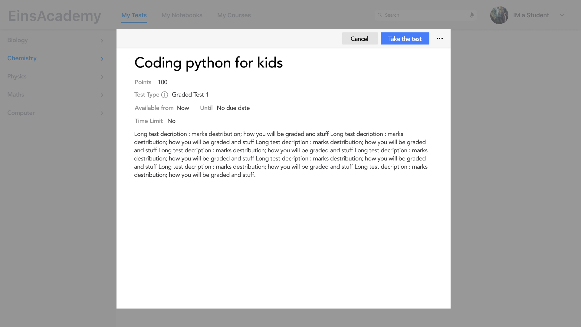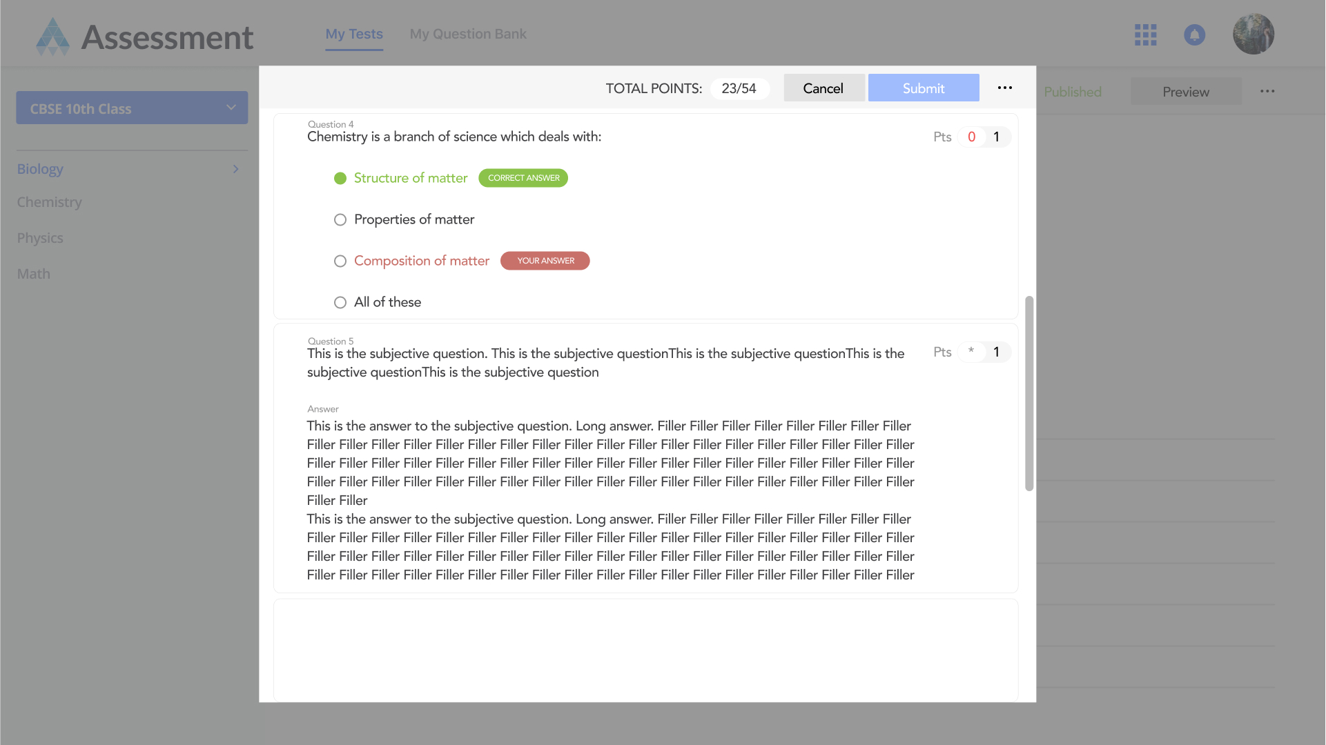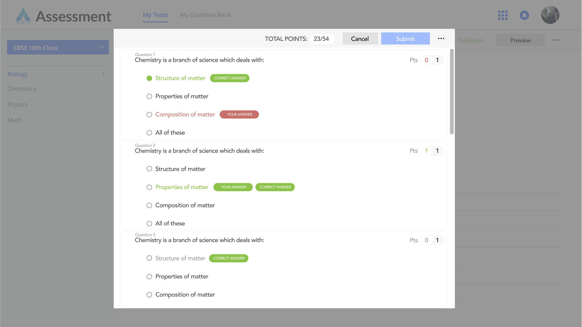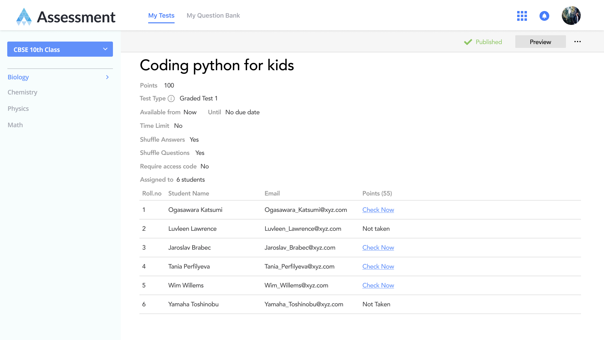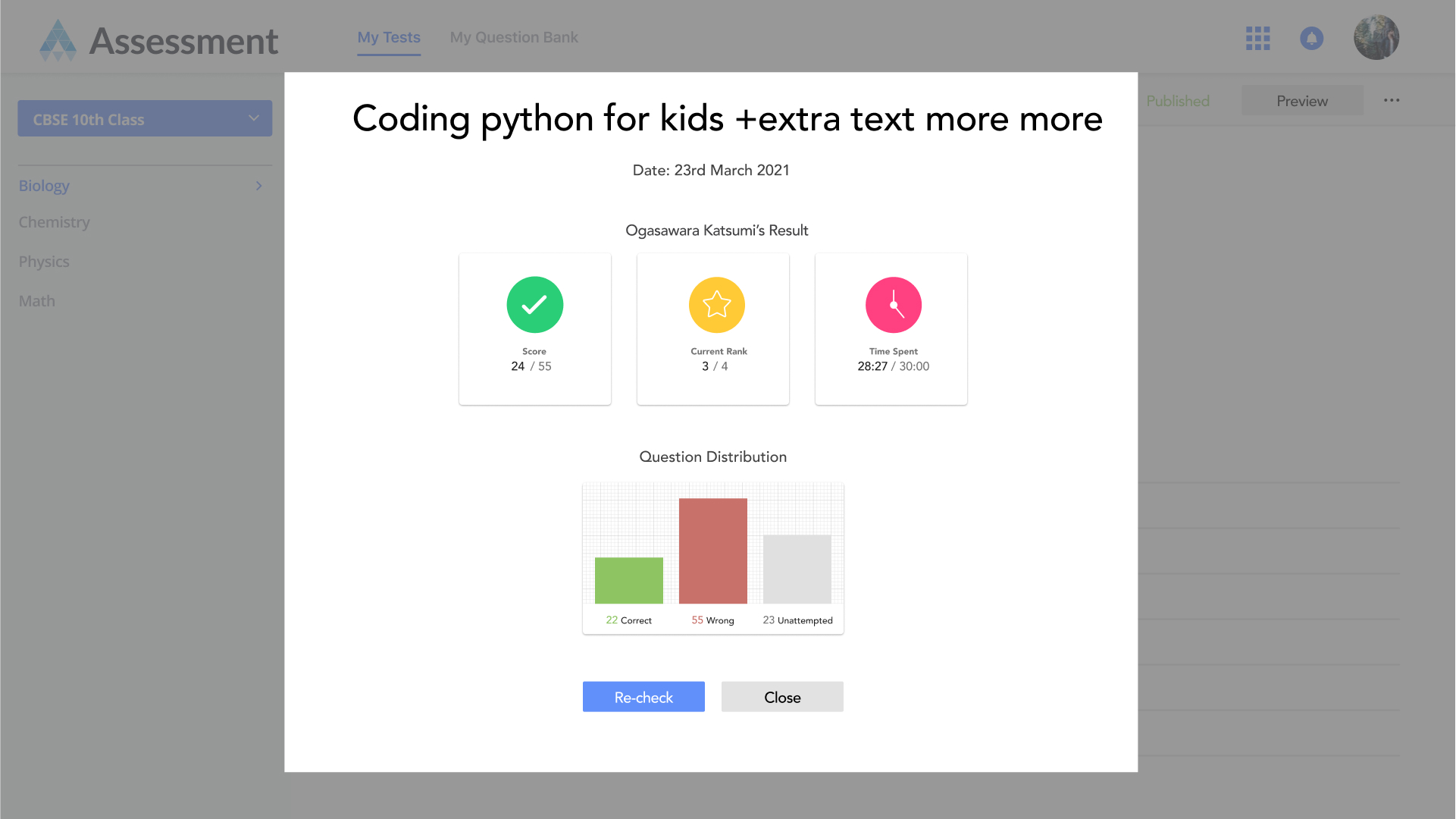 Students see the same einsAssess app in their einsOS dashboard, their einsAssess app shows all the assessments they have received, with their respective statuses. Assessments consisting of all objective questions are automatically marked but assessments with subjective questions are sent to teachers for marking, only after that the results are available for the students.