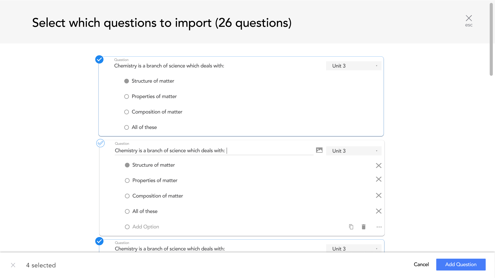 To increase the error tolerance of the system, we auto-filled a default text for both question and answers, and depending on the question type the first answer option is auto-selected as the would-be-answer.